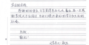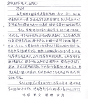学院大学生合法权益保障工程体系的构建并非止步于此,此后还会继续完善、健全相关工作制度,并将该项工作常态化,致力为同学们打造一个安全、舒适、整洁的学习生活环境。同学们对学院该项工作全力配合支持,学院对于意见问题的处理结果也让他们喜笑颜开,对学院满意度大大提高。甚至有学生为表达感谢,向学院相关职能部门与工作人员写了一封感谢信(附文后)