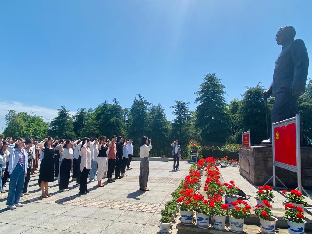 张翠同志宣读了预备党员批复文件,随后,在她的带领下,全体参加仪式的党员面对林伯渠同志的雕像和鲜虹的党旗庄严宣誓。同志们右手握拳高举过肩,庄严承诺,为共产主义奋斗终身。