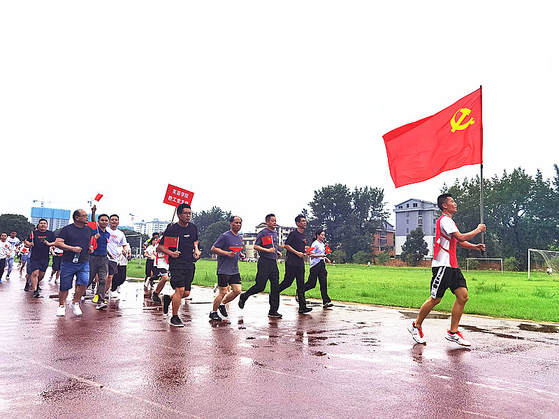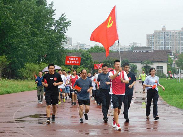 领跑人员高举党旗在前领跑,院领导带领师生们排着整齐的方阵队伍紧跟其后,大家步伐整齐,步调一致,相互帮助,相互鼓励。环校园跑过程中,阵阵激昂的歌曲催人奋进,师生们激情飞扬,矫健的身姿在校园中汇成一片流动的海洋。党旗迎风猎猎,党员勇往直前,红色精神永相传,开启时代新征程。