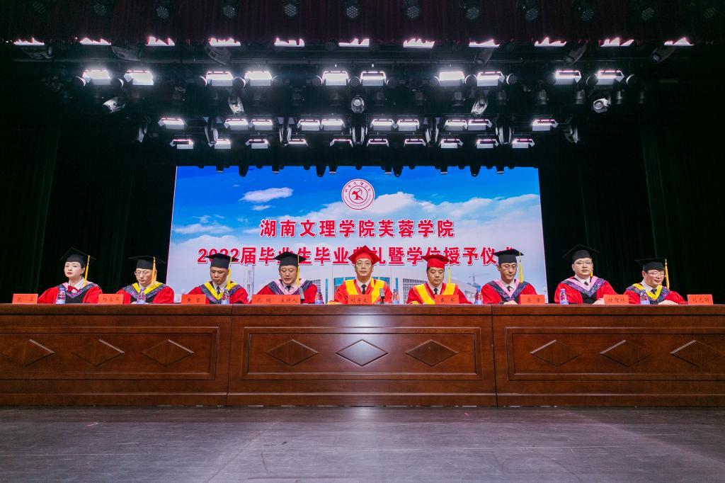 本网讯(通讯员 黄春辉)6月8日上午8点30分,学院2022届毕业生毕业典礼暨学位授予仪式在湖南文理学院艺术中心隆重举行。湖南文理学院党委副书记、校长刘宇文教授,党委委员、副校长戴军教授,芙蓉学院全体党委领导班子成员在主席台就座。学院各教学系、职能部门部负责人、教师代表和2022届毕业生出席典礼。典礼由学院党委书记孔健主持。
