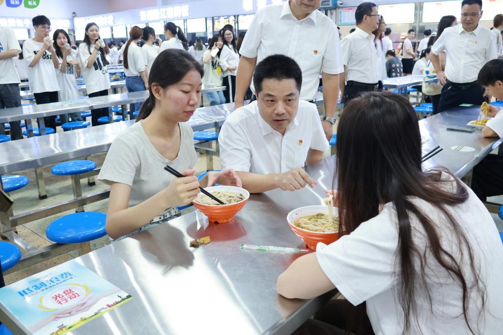 湖南文理学院党委委员、副校长戴军(左二)在食堂与学生亲切交流
