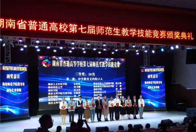 乔湘凌(右一)在颁奖台上本讯网(教学工作部 供稿)10月21至23日,由湖南省教育厅主办、衡阳师范学院承办的湖南省普通高校第七届师范生教学技能竞赛在衡阳市举行,来自...