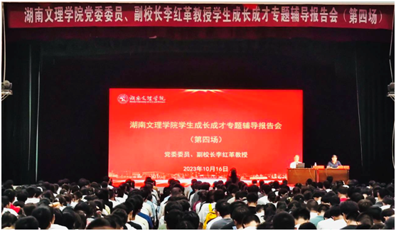 “学生成长成才专题辅导报告会(第四场)”现场湖南文理学院党委委员、副校长李红革为学生授课学院党委书记朱丹主持报告会2023级学生在认真听课本讯网(学生工作部 供稿...