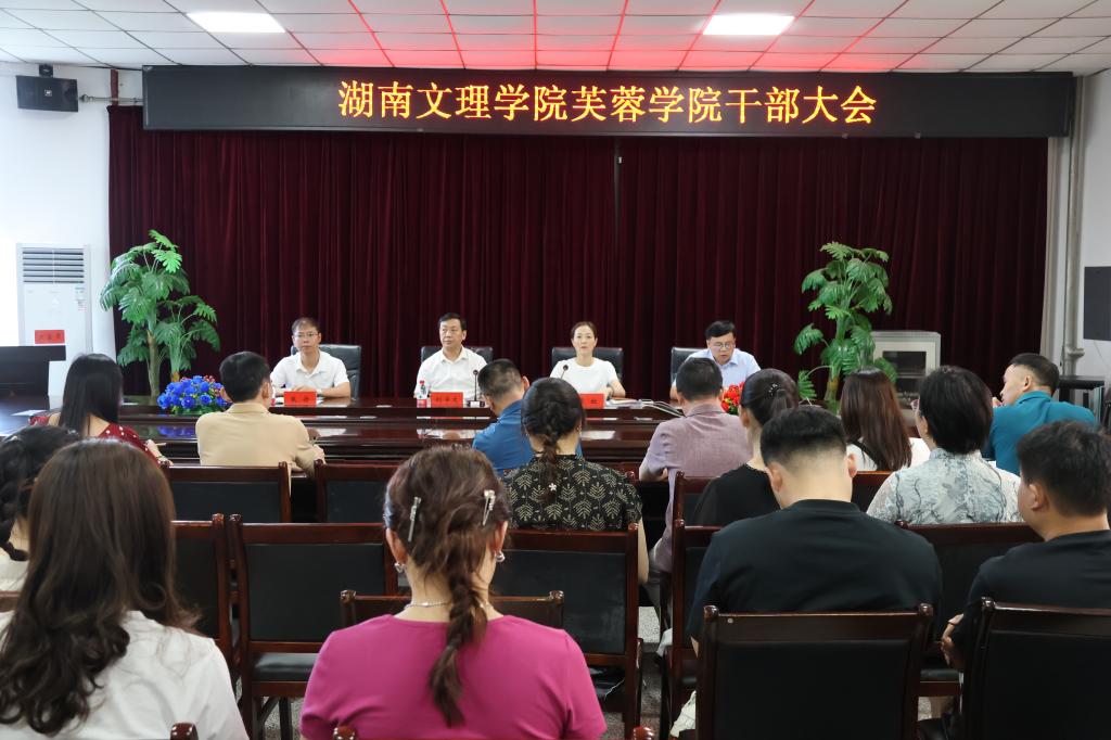 大会现场湖南文理学院党委副书记、校长刘宇文在会上讲话湖南文理学院组织部常务副部长、党校常务副校长李虹宣读任免通知芙蓉学院党委书记朱丹在会上作表态发言芙蓉学院...